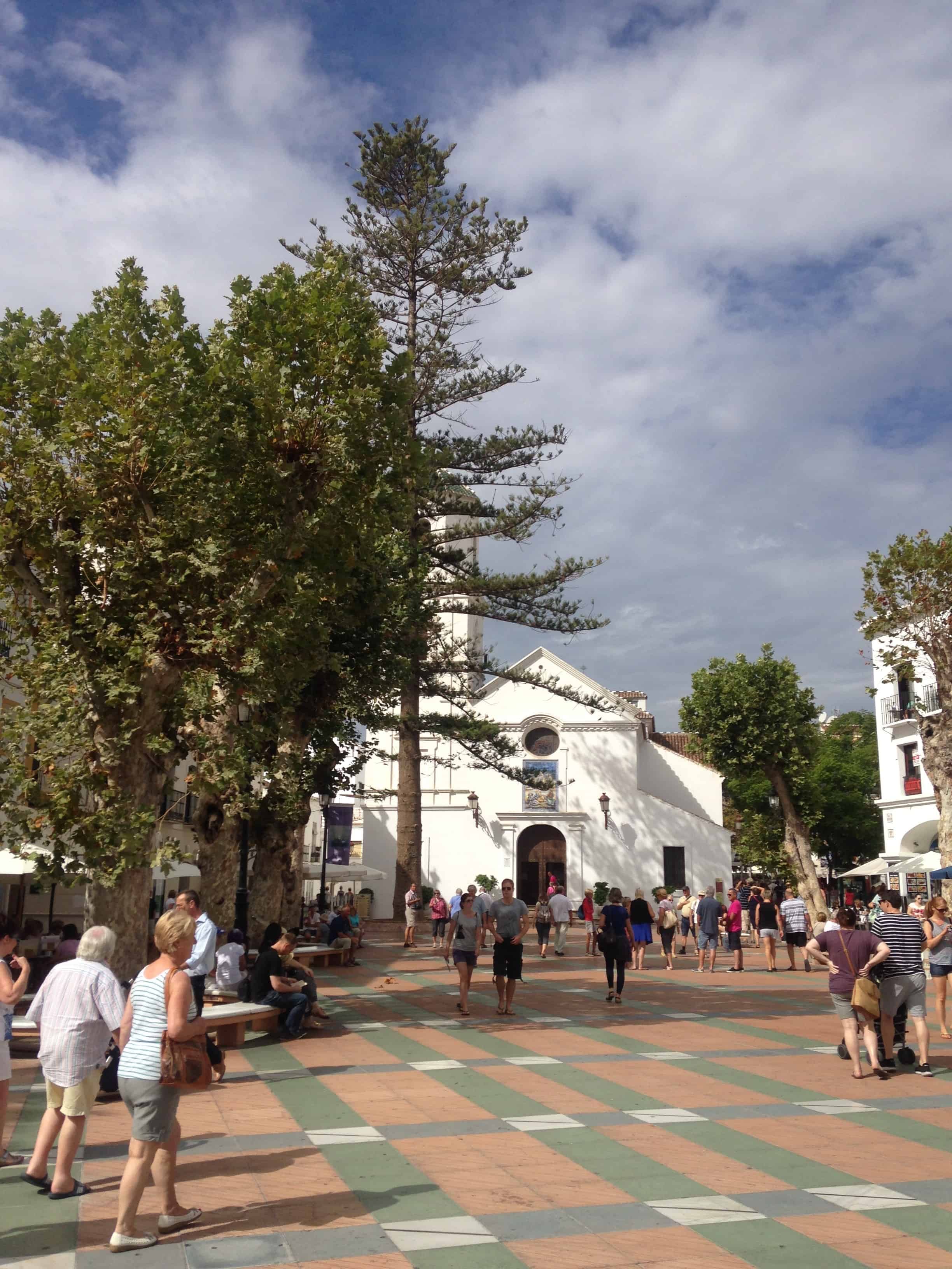 I byen Nerja er det også en smuk kirke på et ligeså smukt torv.